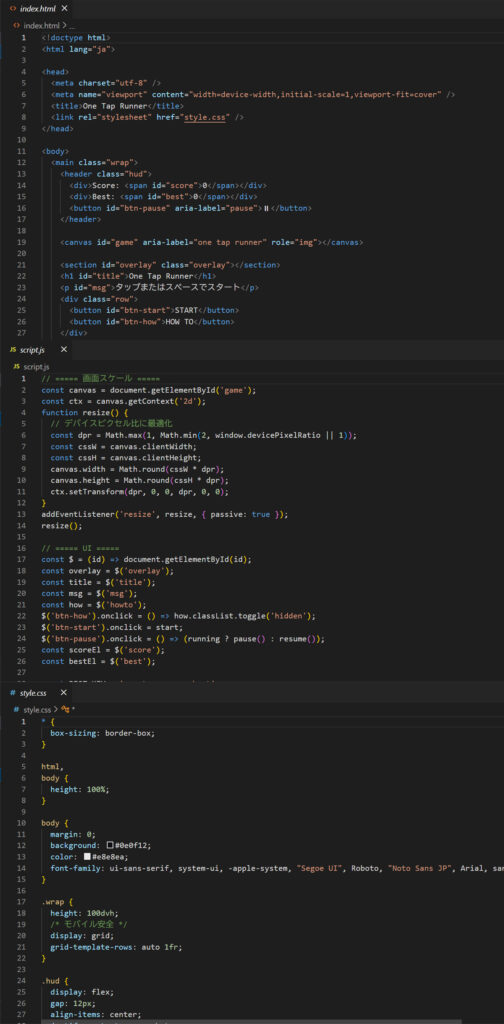 全てのコードをChat GPTが書いてくれるので、そのままVScodeにコピペすると、下のようなゲームができます。画像はかなり短く切り取っています。
