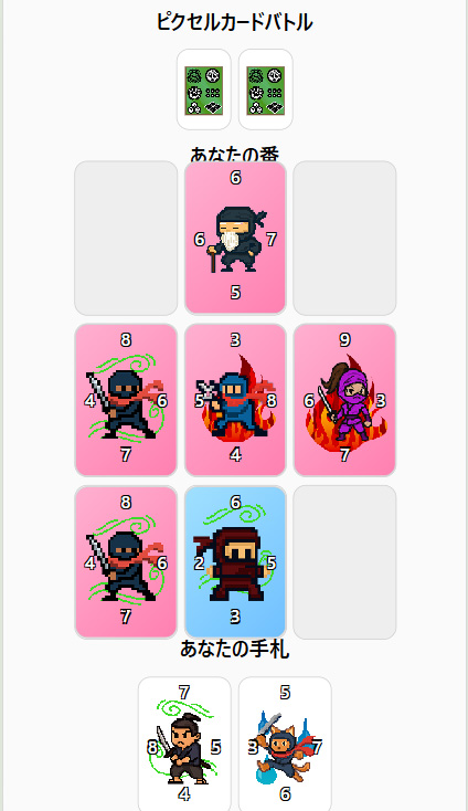 自分は水色、敵はピンク、カードを返されると相手の色になる。御覧の通りピンクだらけ。